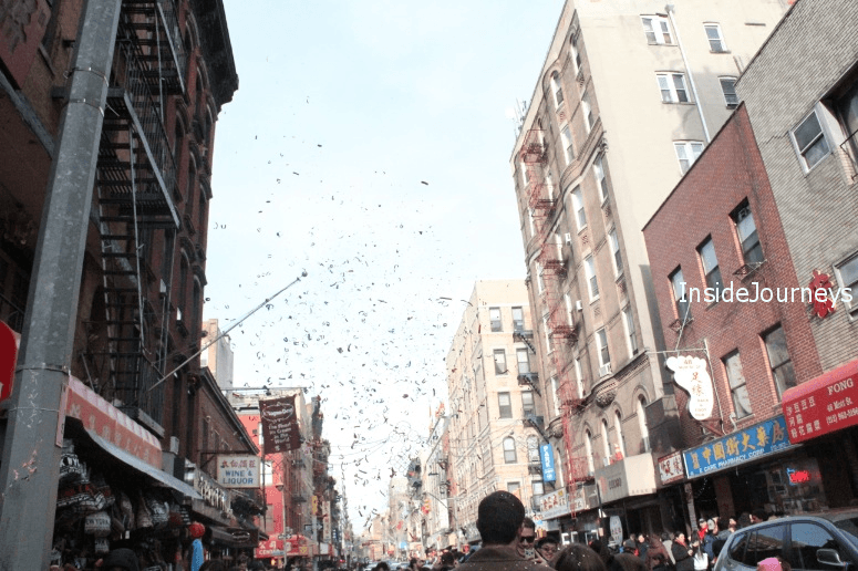 We were in Chinatown for a morning food tour and after the tour, we followed the sounds of firecrackers to a side street off Mott. About a block long, it was so crowded with people that drivers took other streets. At one point, a police car cruised through, the officer using his loudspeaker to tell everyone that the street was not closed. Some minutes later, someone put up yellow tape, effectively creating a pedestrian-only block.