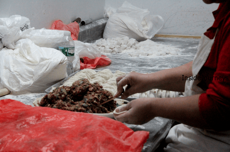A woman was at the stove loading freshly made dumplings into a huge steamer while in the back two others were adding the filling to the dough.