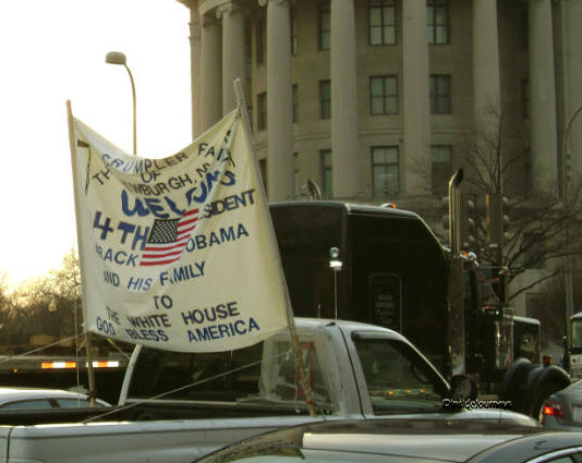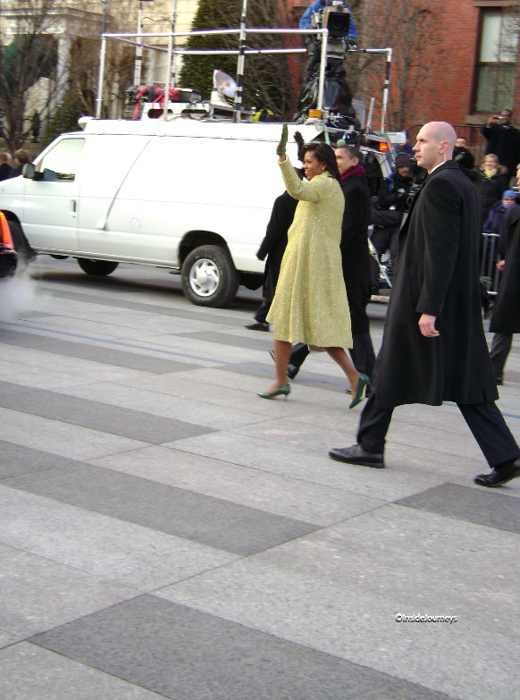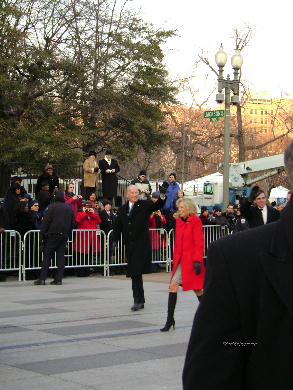 By the time they did, my feet felt like blocks of ice. As they approached, the crowd cheered wildly and pressed forward to get a better look. President and Mrs. Obama exited their limo near where we were standing and walked right in front of us. So did Vice President and Mrs. Biden. Caught up in the excitement, I wanted to see with my own eyes but I also wanted to record the event. I fumbled for a few minutes then focused my camera. It a special moment that I was glad to experience.