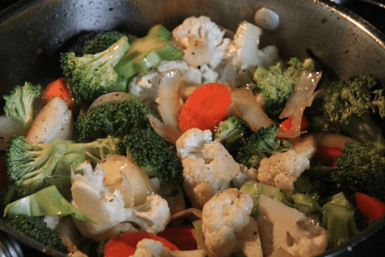 The recipe calls for carrots, zucchini, cauliflower, green cabbage, pak choy, sweet peppers or broccoli but don’t panic if you don’t have them. I use what I have, which is usually broccoli, cauliflower, carrots, and red and yellow peppers. The most important thing, I think, is to have a mix of firm and soft, colorful vegetables to give the dish variety in texture and color.