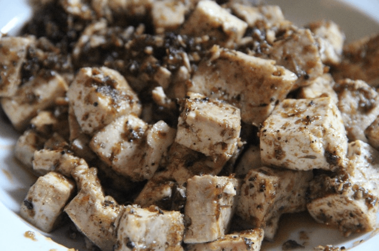- Mix together jerk seasoning and oil, add to tofu and marinate for at least an hour.